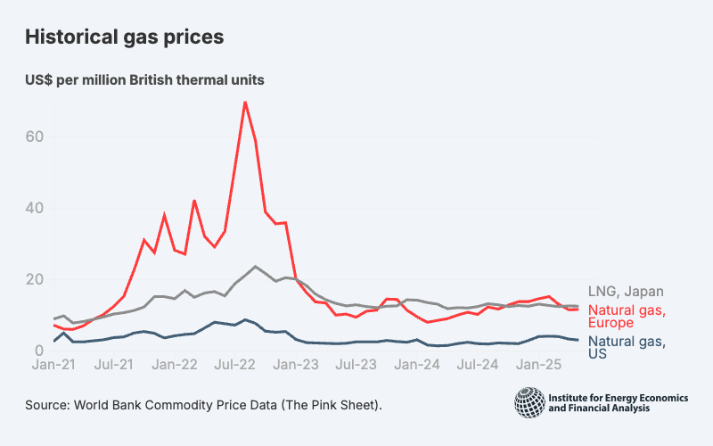 Reducing gas demand is key to decreasing dependency on LNG imports. European gas demand declined by 20% between 2021 and 2024. Its LNG imports fell by 19% year on year in 2024.