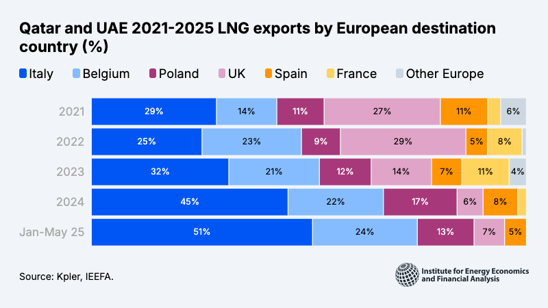 About 50% of Europe’s LNG imports from Qatar and the UAE in 2024 were bought by Italy, 24% by Belgium and 13% by Poland.