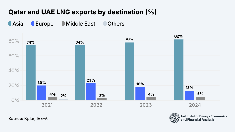 Although Asia is the main destination for LNG from Qatar and the UAE, Europe’s energy security could also be at risk if exports of the fuel from these sources are interrupted. Europe was the destination for 13% of LNG exports from Qatar and the UAE in 2024; 82% of the exports went to Asia. These volumes passed through the Strait of Hormuz.