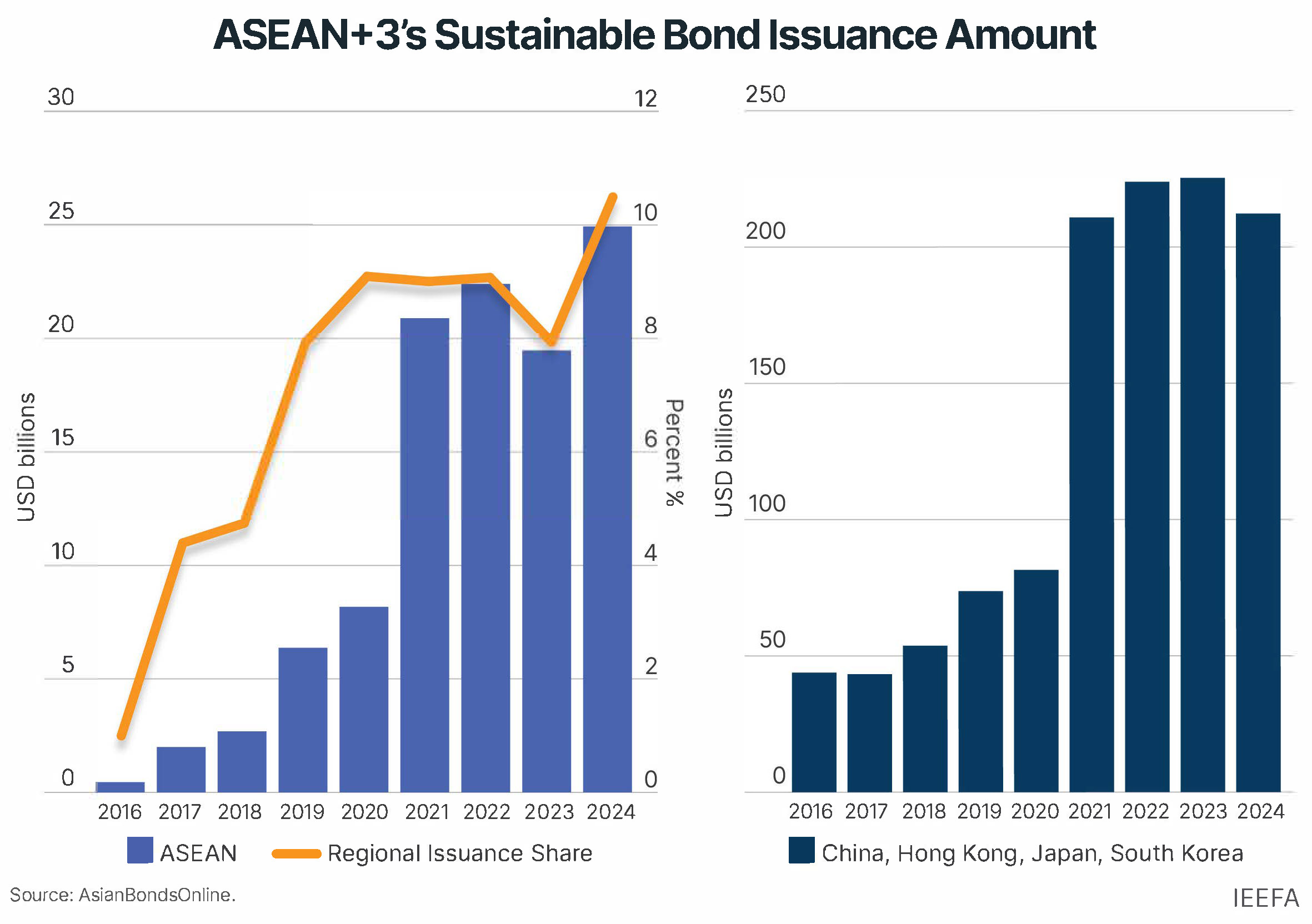 Sustainable bond issuance in Asia accelerated, with outstanding volumes tripling to USD918 billion by the end of 2024. The Association of Southeast Asian Nations (ASEAN) accounted for a double-digit share of ASEAN+3 issuance, while Asia-Pacific premiums remained above global averages.