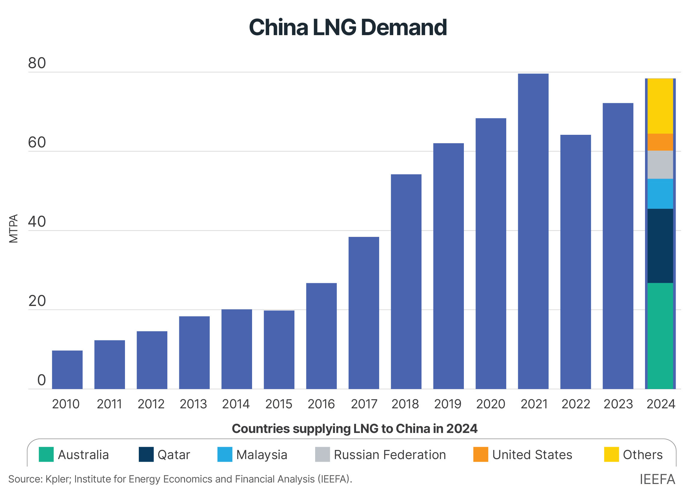 Despite the year-on-year increase in 2024, China’s LNG imports fell 2% shy of record purchases in 2021 and grew at a slower pace than in 2023. The country’s multi-year demand recovery demonstrates the prolonged consequences of market volatility and geopolitical uncertainty on LNG demand.