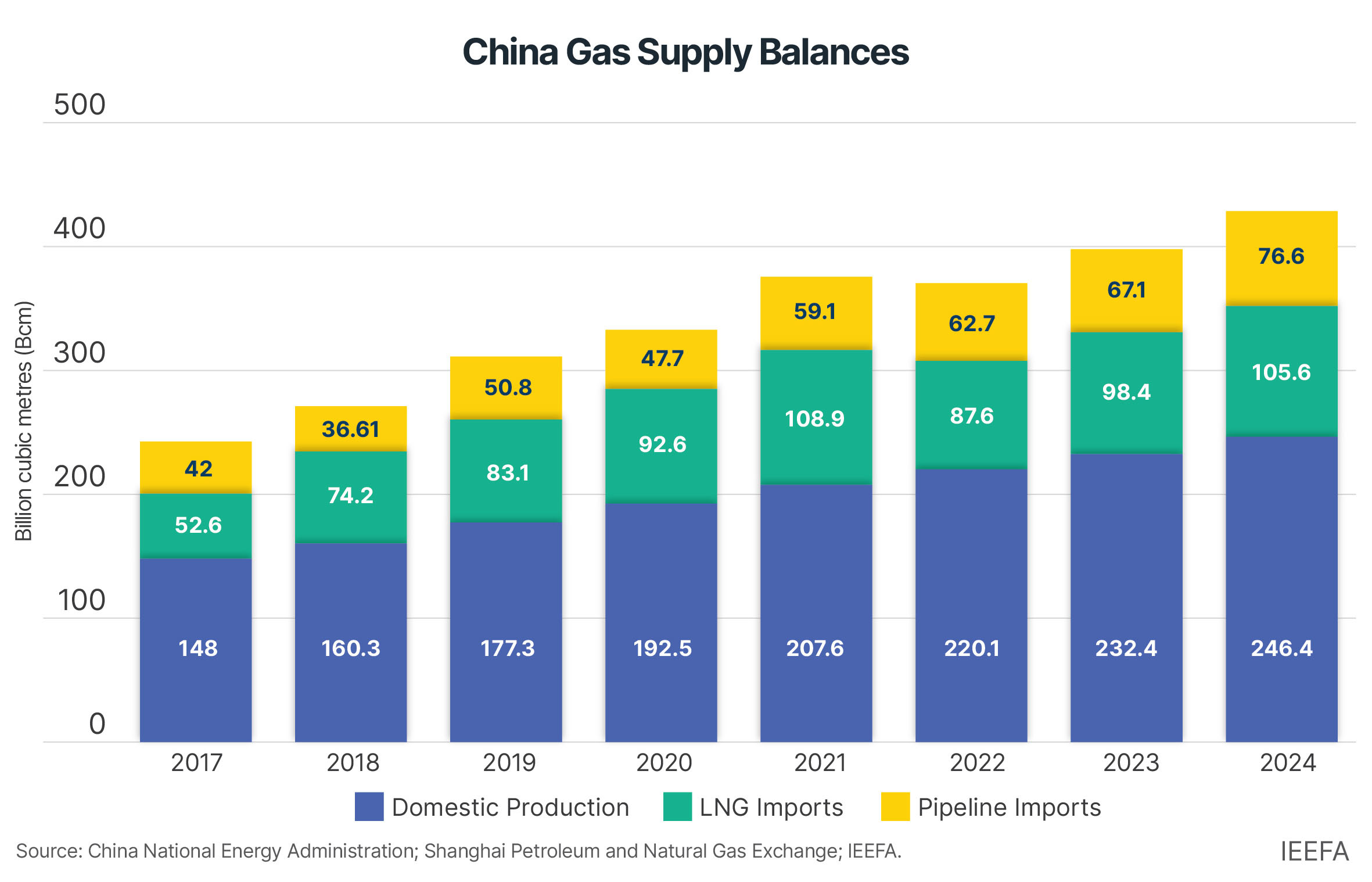 Although new LNG purchase contracts will begin in the coming years, China has met a growing share of its overall natural gas demand from cheaper, more reliable gas sources, namely domestic production and pipeline imports.