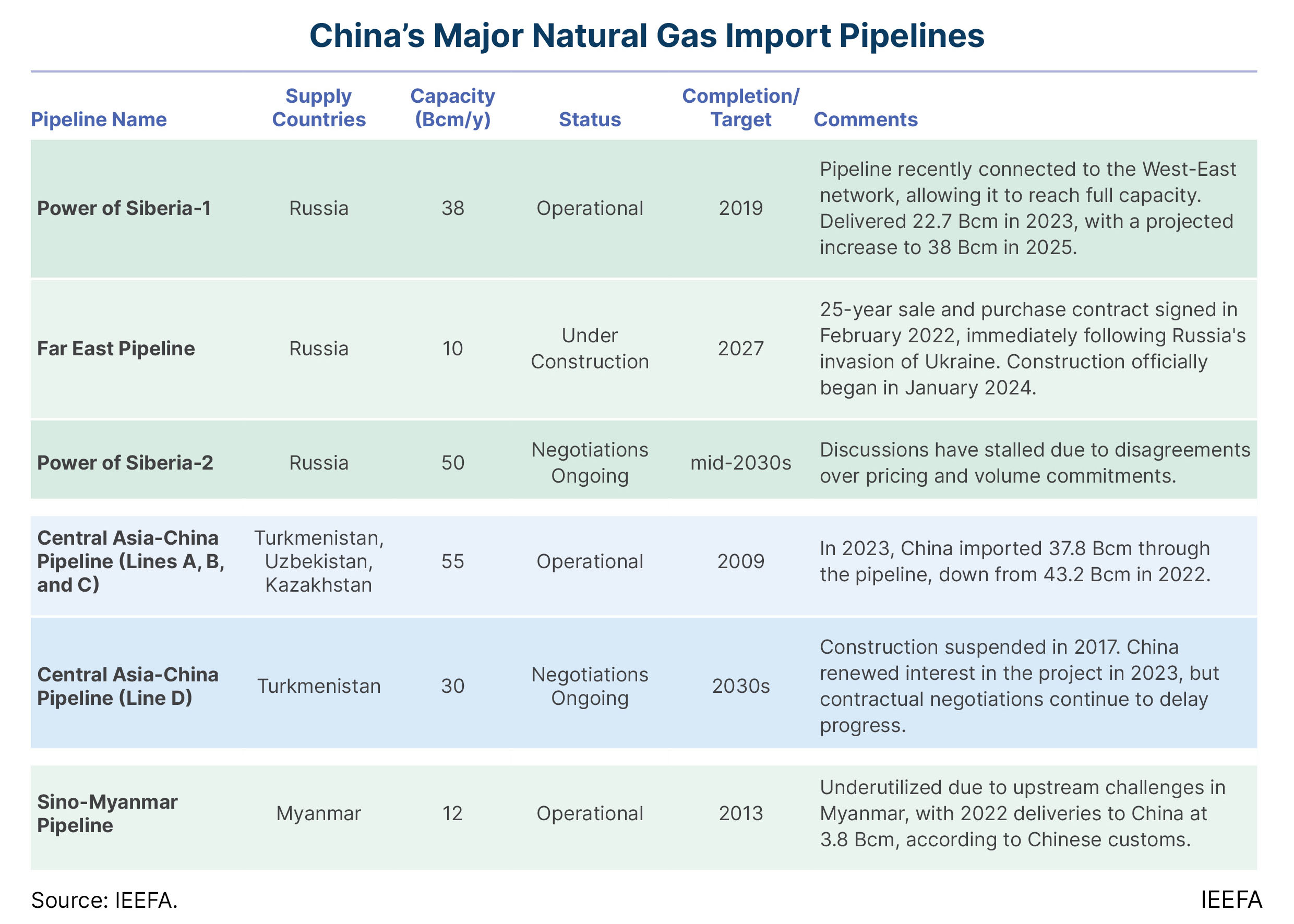 Higher pipeline imports from Russia and Central Asia also contributed to a large share of incremental demand. In particular, flows through the Power of Siberia-1 pipeline from Russia are set to increase from 22.7bcm in 2023 to the pipeline’s full capacity of 38bcm in 2025. In January 2024, China and Russia began constructing the 10bcm/y Far East Pipeline, extending an existing Russian pipeline system to northeastern China by 2027.
