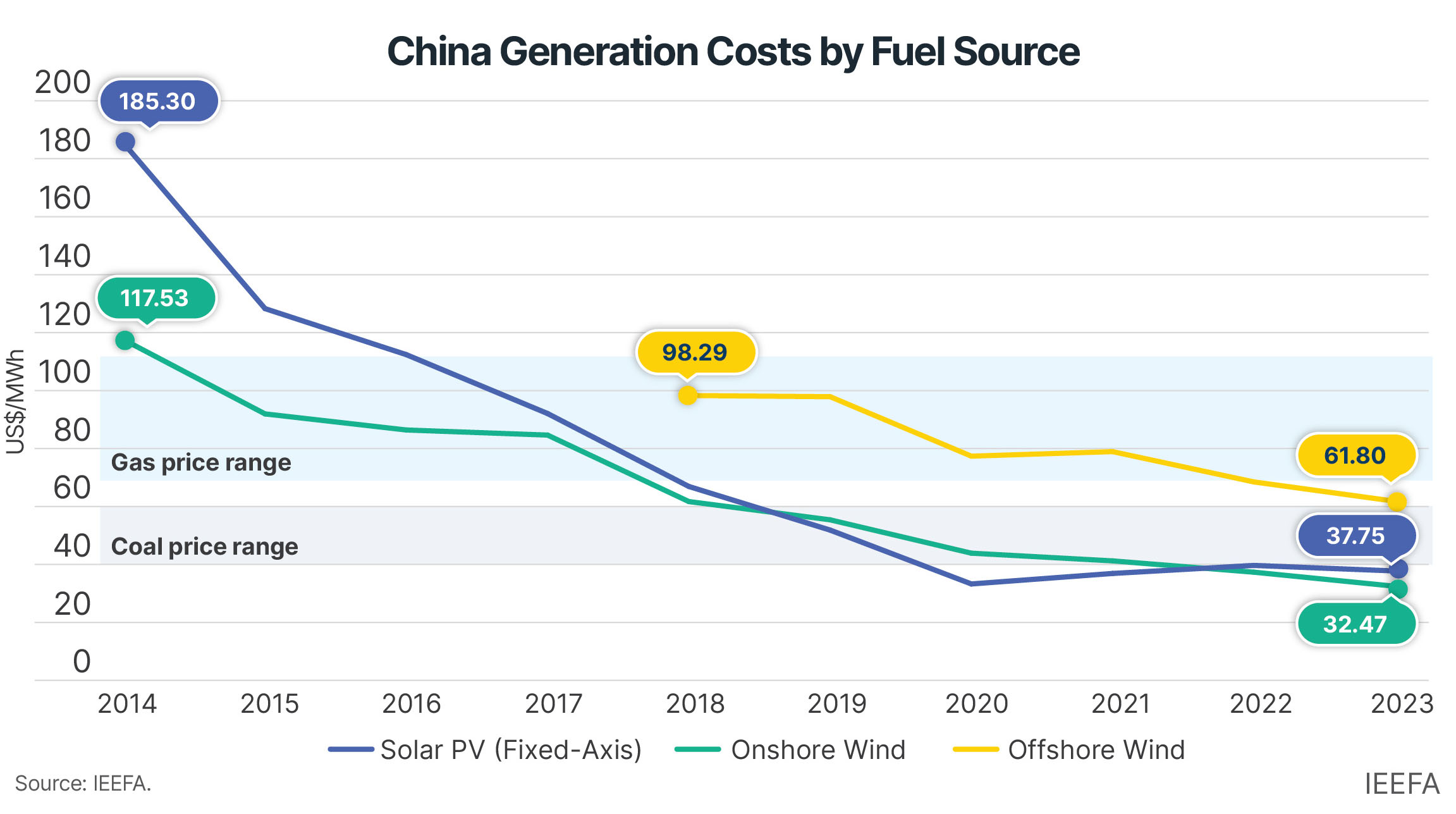 In 2024, China’s renewable energy deployment continued at an unprecedented rate. Solar capacity jumped 277 gigawatts (GW), a 46% increase, alongside nearly 80GW of new wind projects. Total wind and solar capacity reached 1,408GW, surpassing the country’s 2030 target of 1,200GW six years ahead of schedule. Solar and onshore wind are the cheapest sources of power in China, ranging from US$30-90 per megawatt-hour (MWh) lower than gas generation.